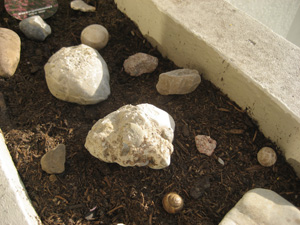 sehr kleinen Mandelart, verschiedenen Steinen und (geharktem) Sand
